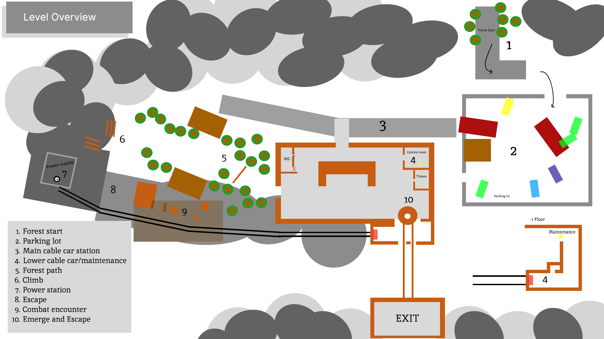This level is a guided escape scenario set in a remote mountain area during an outbreak. The player progresses from a dense forest into a cable car facility, using diegetic indicators, controlled sight lines, and environmental storytelling to navigate. The structure is built around clear goal hierarchy, gradual reveal of the play space, and escalating tension as the player activates power systems and fights their way toward the final escape via the cable cars. The design focuses on readable navigation, pacing variety, exploration loops, and a strong visual connection between key landmarks.